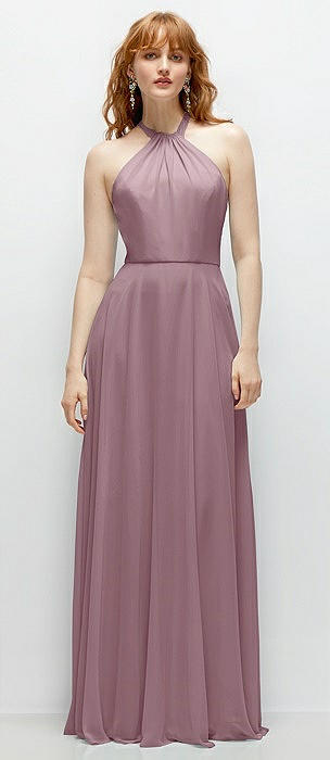 Shirred Halter Chiffon Maxi Dress with Back Sash-Tie Closure