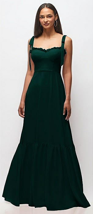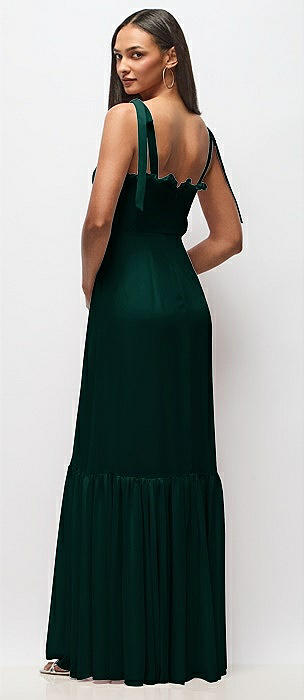 Tie-Shoulder Bustier Bodice Ruffle-Hem Maxi Dress in evergreen