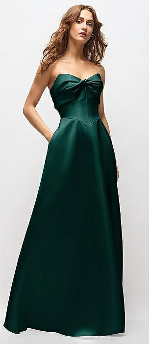 Strapless Cuff Satin Midi Dress with Column Skirt & Back Bow in evergreen