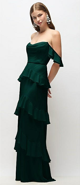 Off-the-Shoulder Cowl Chiffon Tiered Ruffle Maxi Dress with Convertible Ruffle Straps in evergreen