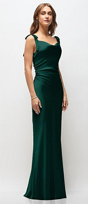 Soft Cowl Neck Ruched Side Satin Bias Maxi Dress with Shoulder Bows in evergreen