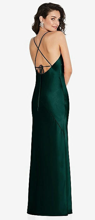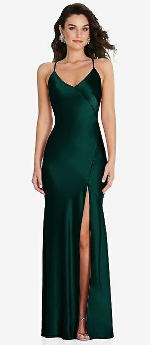 V-Neck Convertible Strap Bias Slip Dress with Front Slit in evergreen