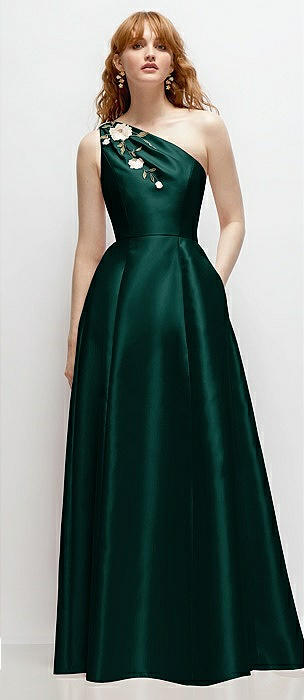 One-Shoulder Full A-Line Satin Gown with Handworked Floral Appliqué in evergreen