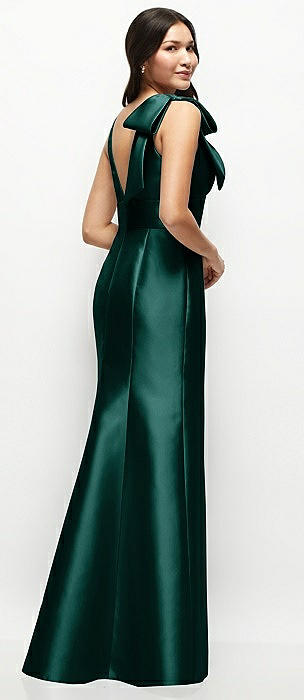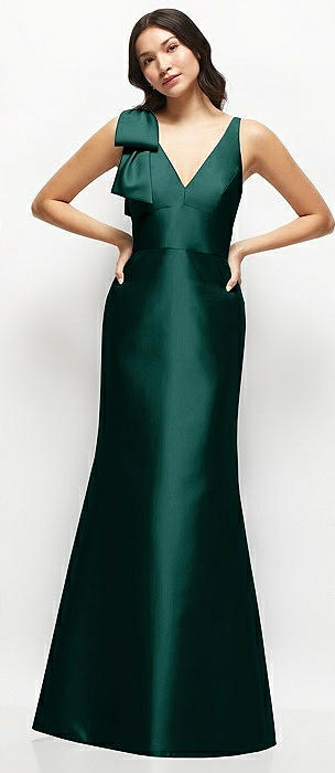 Deep V-back Satin Trumpet Dress with Cascading Bow at One Shoulder in evergreen