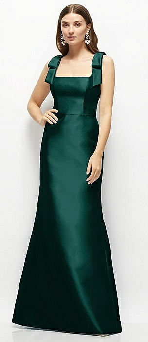 Satin Fit and Flare Maxi Dress with Shoulder Bows in evergreen