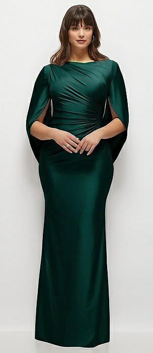 Draped Stretch Satin Maxi Dress with Built-in Capelet in evergreen
