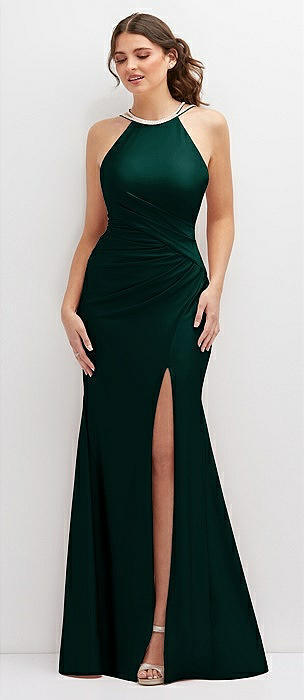 Shirred Skirt Jewel Neck Halter Dress with Front Slit in evergreen