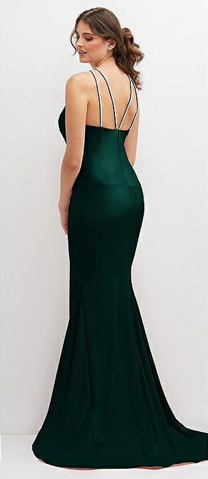Halter Asymmetrical Draped Stretch Satin Mermaid Dress with Rhinestone Straps in evergreen
