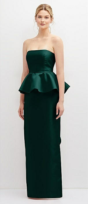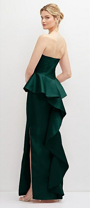 Strapless Satin Maxi Dress with Cascade Ruffle Peplum Detail in evergreen