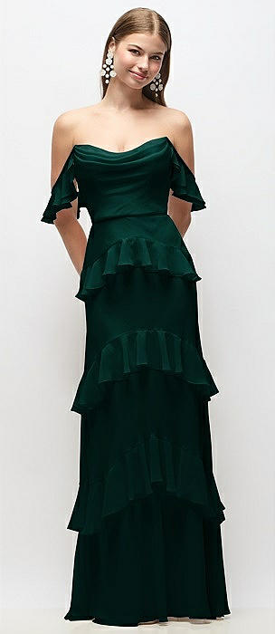 Off-the-Shoulder Cowl Chiffon Tiered Ruffle Maxi Dress with Convertible Ruffle Straps in evergreen