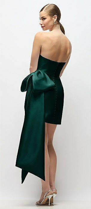 Strapless Pleated Draped Satin Mini Dress with Dramatic Long Tail Bow & Covered Buttons in evergreen