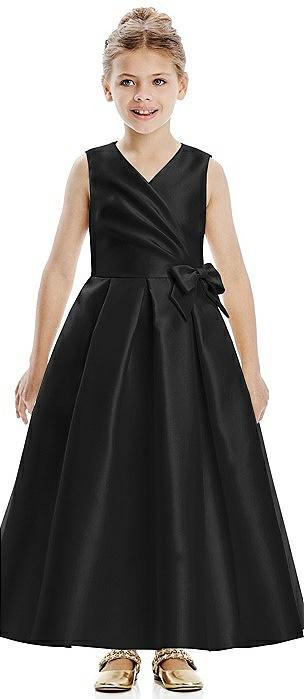 Faux Wrap Pleated Skirt Satin Twill Flower Girl Dress with Bow in black