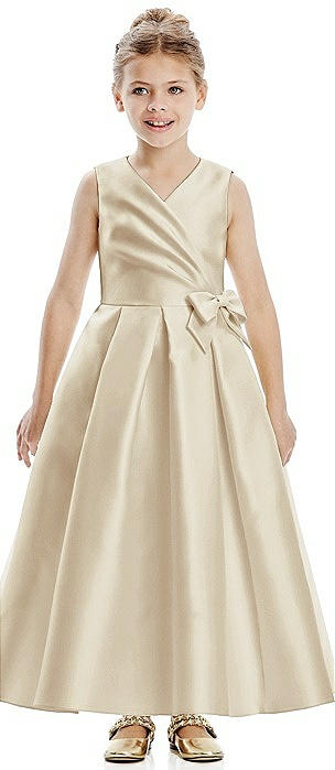 Faux Wrap Pleated Skirt Satin Twill Flower Girl Dress with Bow in champagne