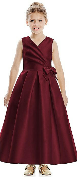 Faux Wrap Pleated Skirt Satin Twill Flower Girl Dress with Bow in cabernet