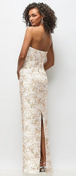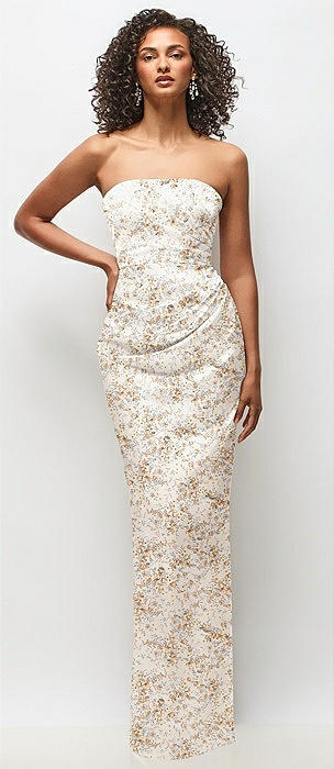 Strapless Draped Bodice Floral Stretch Satin Column Maxi Dress in golden hour