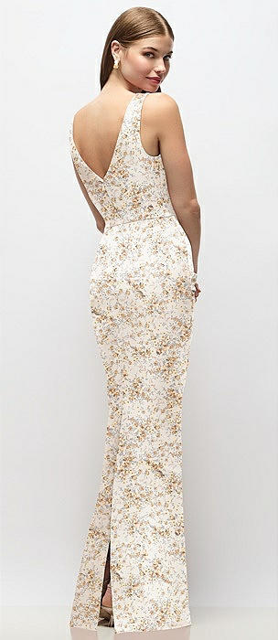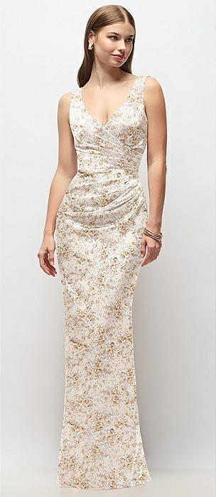 Sleeveless Draped Wrap Bodice Floral Stretch Satin Column Maxi Dress in golden hour