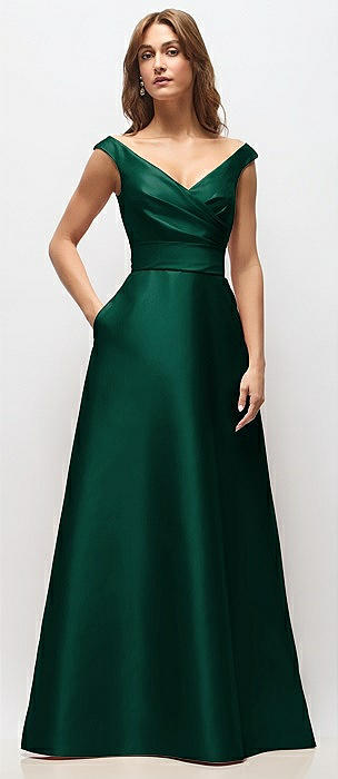 Off-the-Shoulder Draped Wrap Satin Maxi Dress in hunter green