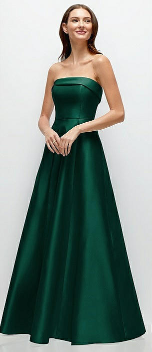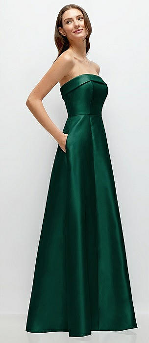 Strapless Bias Cuff Bodice Satin Gown with Pockets in hunter green