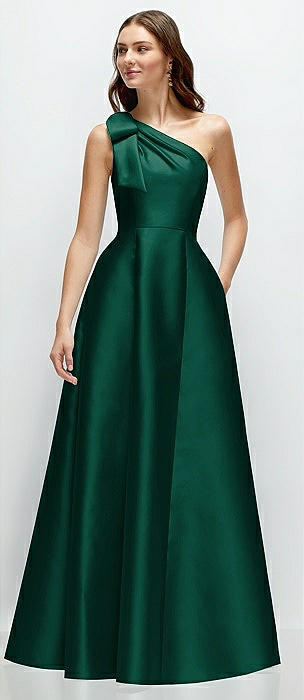 Bow One-Shoulder Full A-Line Satin Maxi Dress in hunter green