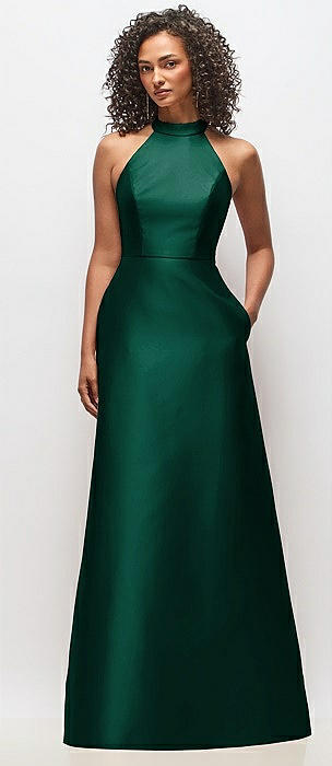 High-Neck Halter Open-Back Satin Trumpet Dress in hunter green