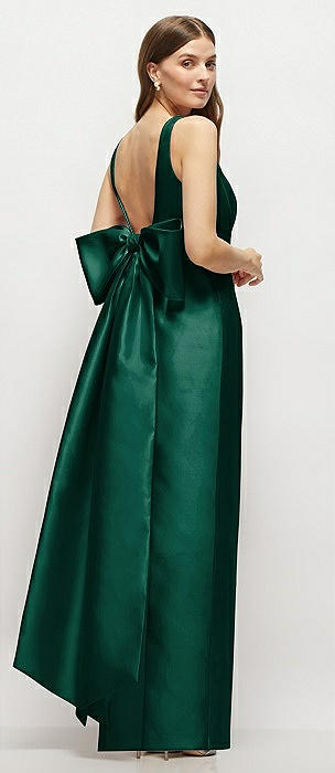 Deep V-back Satin Trumpet Dress with Cascading Bow at One Shoulder in hunter green