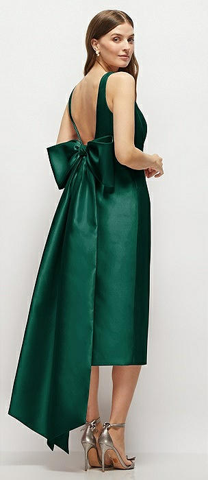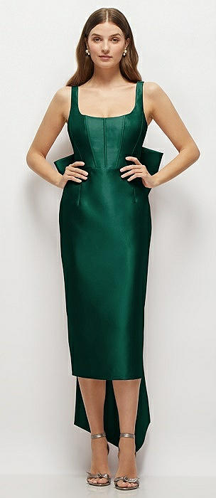 Scoop Neck Corset Satin Midi Dress with Floor-Length Bow Tails in hunter green