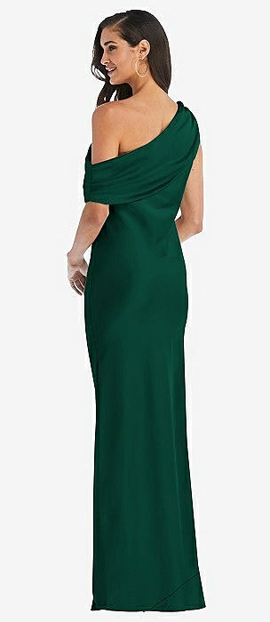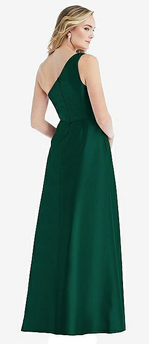 One-Shoulder Satin Gown with Draped Front Slit and Pockets in hunter green