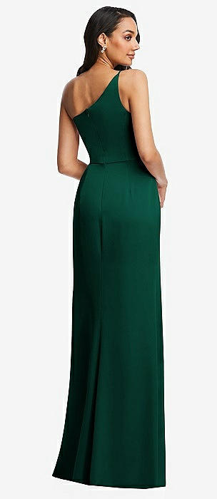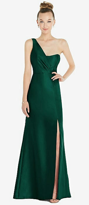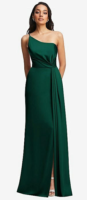 Draped One-Shoulder Satin Trumpet Gown with Front Slit in hunter green