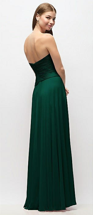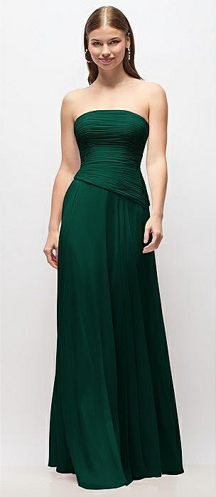 Strapless Chiffon Maxi Dress with Asymmetrical Ruched Drop Waist in hunter green