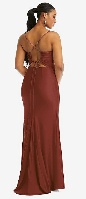 Cowl-Neck Open Tie-Back Stretch Satin Mermaid Dress with Slight Train in auburn moon