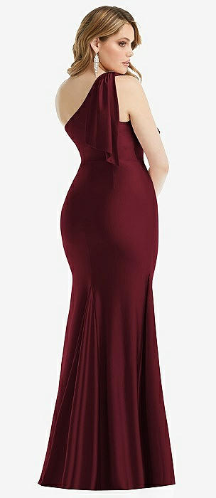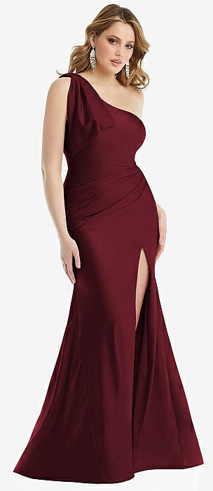 Cascading Bow One-Shoulder Stretch Satin Mermaid Dress with Slight Train in cabernet
