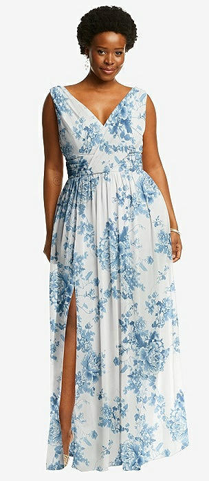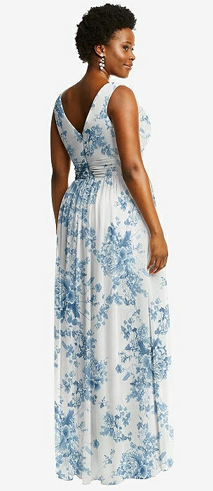 Sleeveless Draped Chiffon Maxi Dress with Front Slit in cottage rose dusk blue