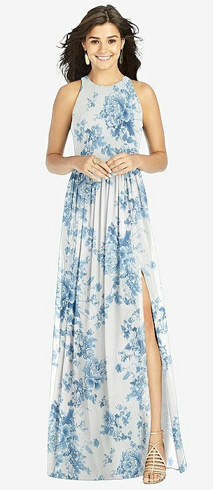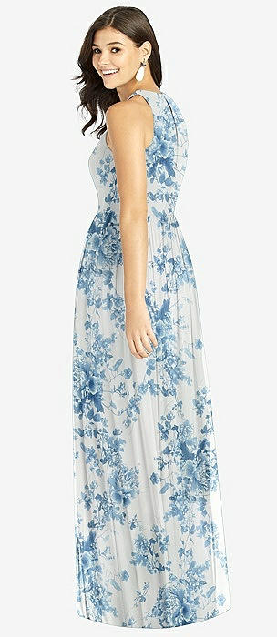 Shirred Skirt Jewel Neck Halter Dress with Front Slit in cottage rose dusk blue