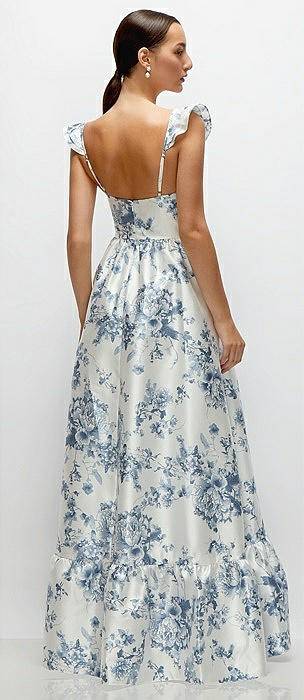 Floral Satin Corset Maxi Dress with Ruffle Straps & Skirt in cottage rose larkspur