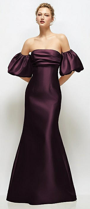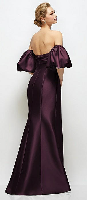Off-the-Shoulder Puff Sleeve Satin Maxi Dress with Flared Skirt in deep plum