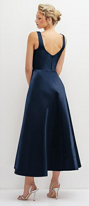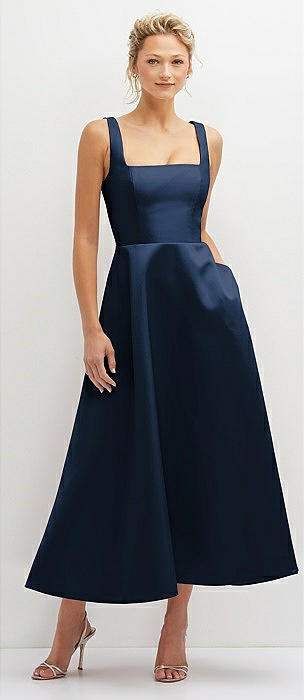 Square Neck Satin Midi Dress with Full Skirt & Pockets in midnight navy