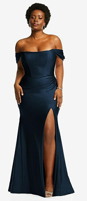 Off-the-Shoulder Corset Stretch Satin Mermaid Dress with Slight Train in midnight navy
