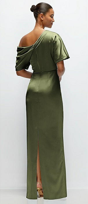 One-Shoulder Asymmetrical Cowl Back Stretch Satin Mermaid Dress in olive green