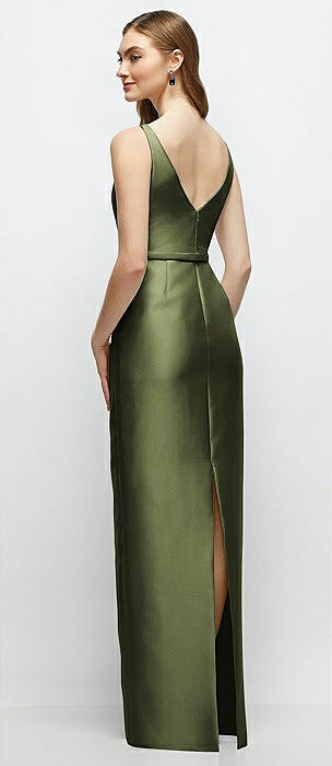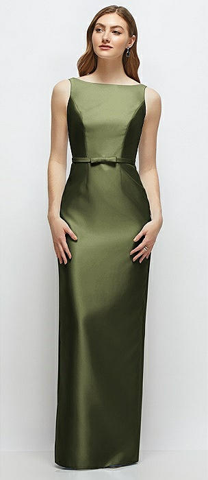 Bateau Neck Satin Column Dress with Bow-Trimmed Skinny Belt in olive green