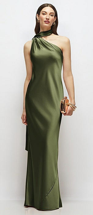 Draped Scarf One-Shoulder Bias Stretch Satin Maxi Dress in olive green