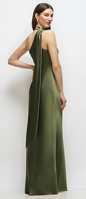 Pleated Halter Bias Satin Maxi Dress with Self-Tie Bow Back in olive green