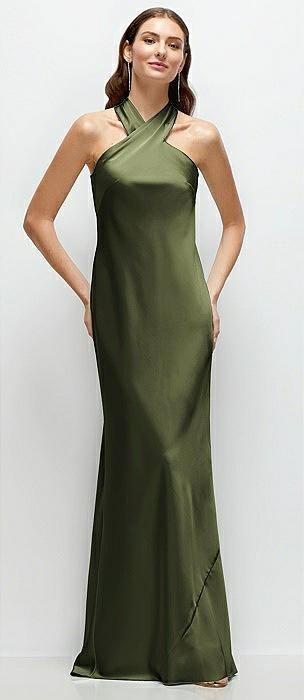 High Cowl Neck Open-Back Stretch Satin Bias Maxi Dress in olive green