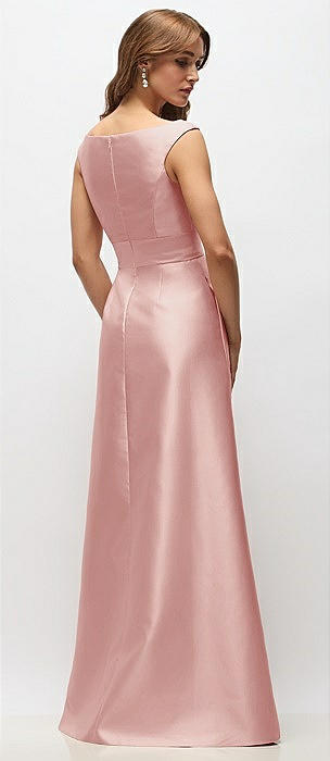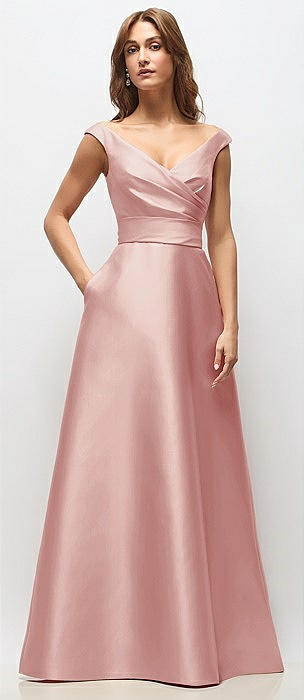 Off-the-Shoulder Draped Wrap Satin Maxi Dress in rose