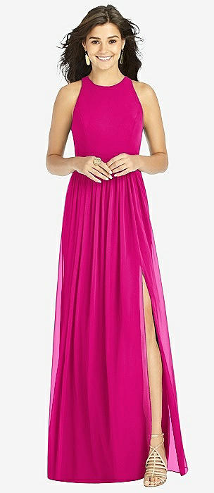 Shirred Skirt Jewel Neck Halter Dress with Front Slit in think pink