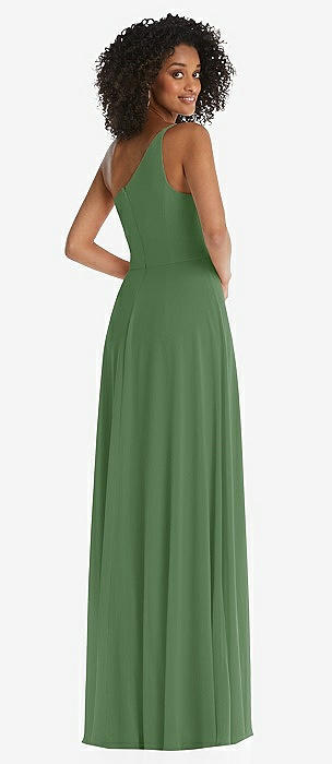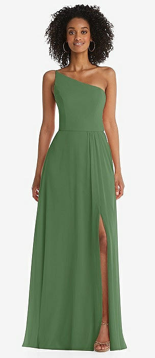 One-Shoulder Chiffon Maxi Dress with Shirred Front Slit in vineyard green