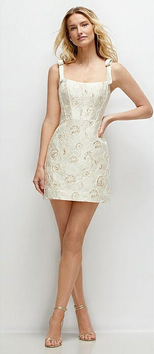 Strapless Cat-Eye Corset Ivory Gold Gilt Rosette Brocade Mini Dress with Ruffle Hem in ivory gold rosette