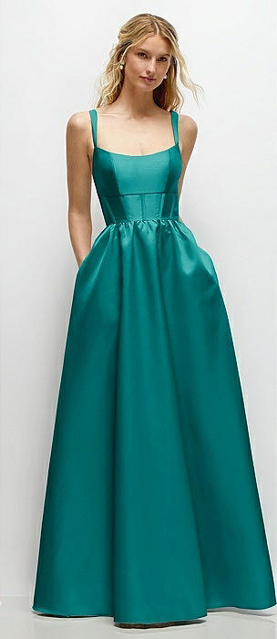Scoop Neck Drop Basque Skirt Satin Maxi Dress with Pockets in jade