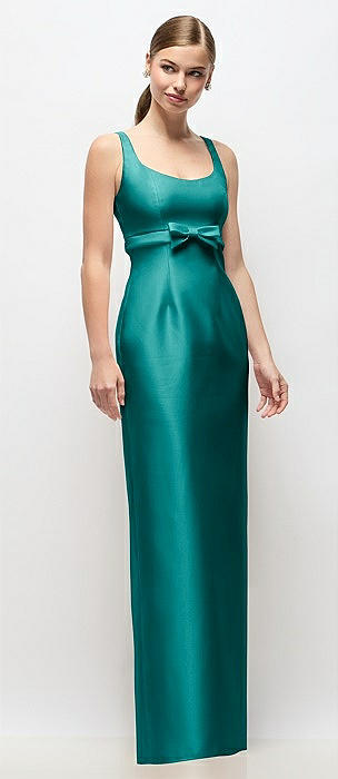 Scoop Neck Satin Column Maxi Dress with Bow at Empire Waist in jade