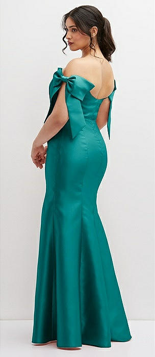 Off-the-Shoulder Bow Satin Corset Dress with Fit and Flare Skirt in jade
