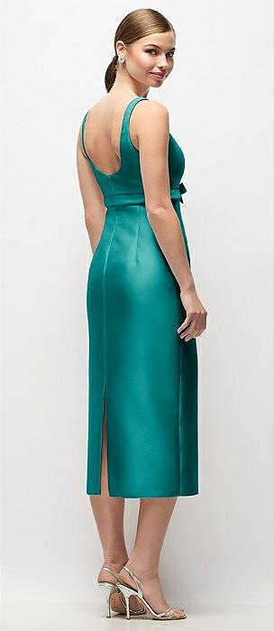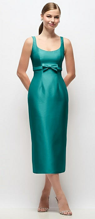 Scoop Neck Satin Column Midi Dress with Bow at Empire Waist in jade